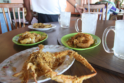 I have this theory that taxi drivers know where all the best food is. In fact, there's even been books written about this theory. We lucked out in having a great taxi driver (RM25/hr) take us around town, since much of KT's sites are inaccessible via foot or public transit. After sightseeing, he took us to this great seafood stall (or warung) near the airport, and right next to the beach. It was great - Malay style fried seafood - shrimp, small crabs, keropok (fish sausage), sotong (calamari). You knew it was fresh, and the location was completely random. Those dishes, plus a limau ais (iced lime juice) makes a perfect snack after a day of sightseeing.