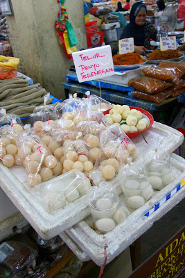 On the other hand - lots of tourists (and locals) love to come to KT to eat... turtle eggs! I was shocked. We were exploring Pasar Panyang, the main market in KT, and nearly each stall had these small plastic bags filled with ping-pong ball shaped turtle eggs. I sure hoped they weren't the endangered ones. Sure enough, when S's family came into town, they bought some turtle eggs to try. And - like a good (but a bit scared) foodie, I tried one (again, praying that wasn't an endangered one). S's mom cooked them in the teapot in the resort hotel, and interestingly, no matter how long you cook it, the white part doesn't become completely hard. I tried one.. and it tasted like a salty potato, with a similar texture. Egh - not so sure why people like it so much.